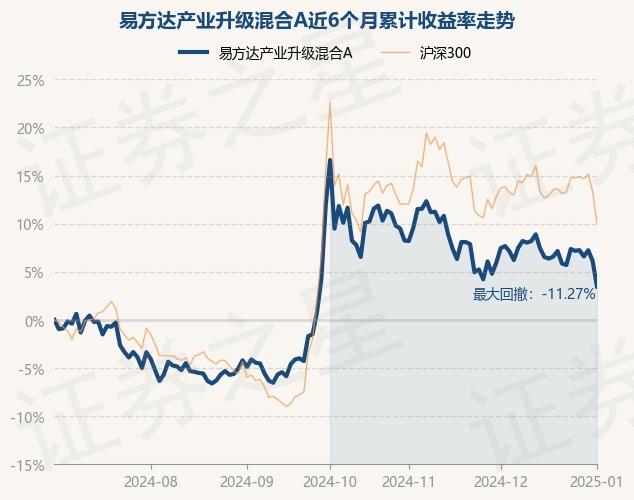本站消息,1月2日,易方达产业升级混合A最新单位净值为0.8053元,累计净值为0.8053元,较前一交易日下跌2.52%。历史数据显示该基金近1个月下跌3.72%,近3个月下跌7.53%,近6个月上涨3.47%,近1年上涨11.6%。该基金近6个月的累计收益率走势如下图: